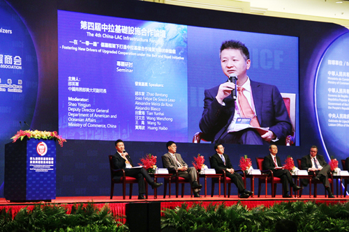 黃海波(左一)在第四屆中拉基礎(chǔ)設(shè)施合作論壇上發(fā)表演講