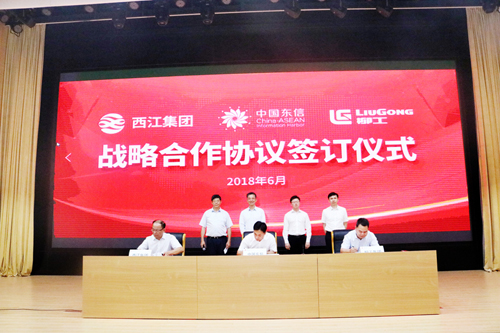 6月14日,自治區國有企業走進中國—東盟信息港合作交流會暨簽約儀式在中國—東盟信息港股份有限公司(以下簡稱“中國東信”)隆重舉行,此次交流會以“實施創新驅動,促高質量發展”為主題。會上,中國東信分別與西江集團、柳工集團簽署了戰略合作協議。